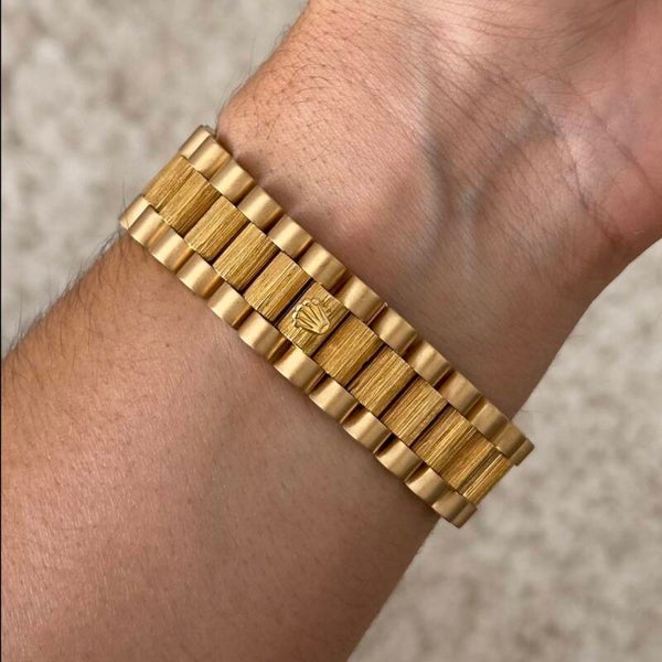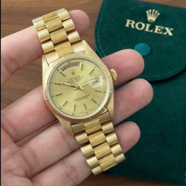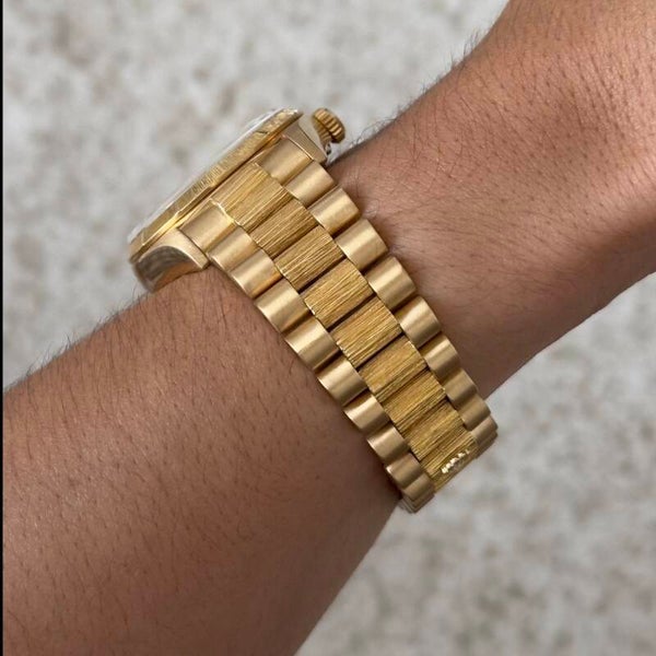 Rolex Daydate 36mm com acabamento Bark em ouro amarelo 18 quilates em ótimas condições.
