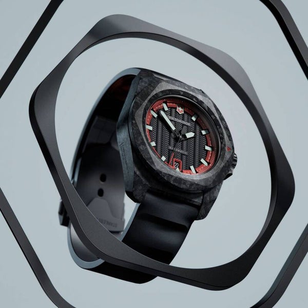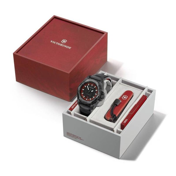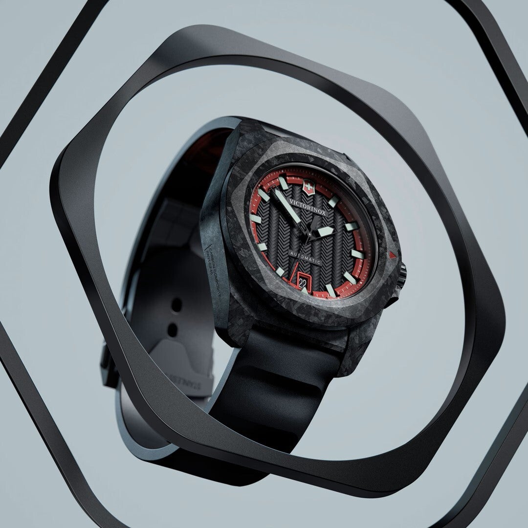 O I.N.O.X. Automatic com caixa de carbono é caracterizado por sua excepcional leveza e durabilidade. Seus mostradores, inspirados nas majestosas montanhas suíças, evocam o espírito de aventura. A caixa apresenta linhas limpas e uma luneta redesenhada como se tivesse sido esculpida por um canivete afiado, enquanto o contrapeso do ponteiro dos segundos lembra o icônico canivete suíço. Este relógio combina desempenho e estética com proteção antimagnética, resistência a choques e resistência à água com certificação ISO. Apresentado como uma edição especial com um canivete suíço correspondente, ele é projetado, fabricado, montado e testado no Centro de Competência Relojoeira em Delémont, na Suíça.